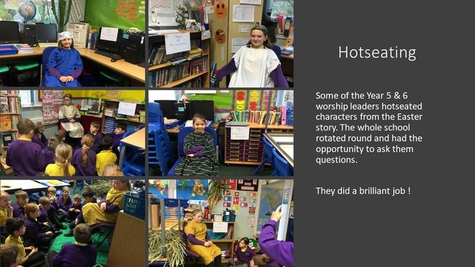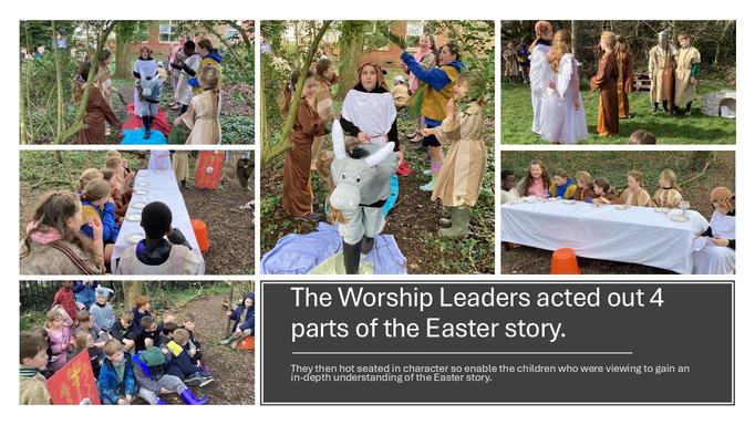 The Easter Story: Acted out in 4 sections by the worship leaders, the children were taken on a journey through The Triumphal Entry, The Last Supper, The death of Jesus and The Resurrection of Jesus. After each scene, the characters from the story were 'hot-seated' enabling the audience to gain a deeper understanding of character's actions and motives.