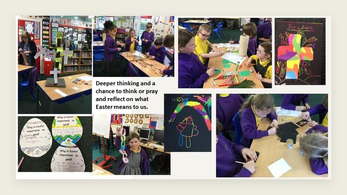 2) What does it mean to me? Here, the children explored different activities relating to parts of the Easter story for example - friendship at the Last Supper. They were then able to pray or think about important aspects of their own lives such as worries, forgiveness, friendship, injustice, hopes and dreams and complete small reflective activities based around these to aid their thoughts or prayers.