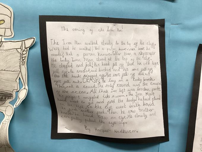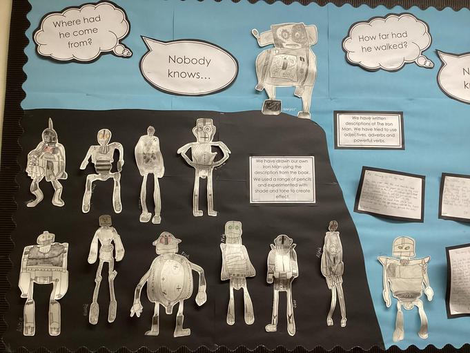 We are currently reading The Iron Man by Ted Hughes. We have drawn our own Iron Man, using different sketching pencils to create shade and tone. We have also written descriptions of the Iron Man using similes.