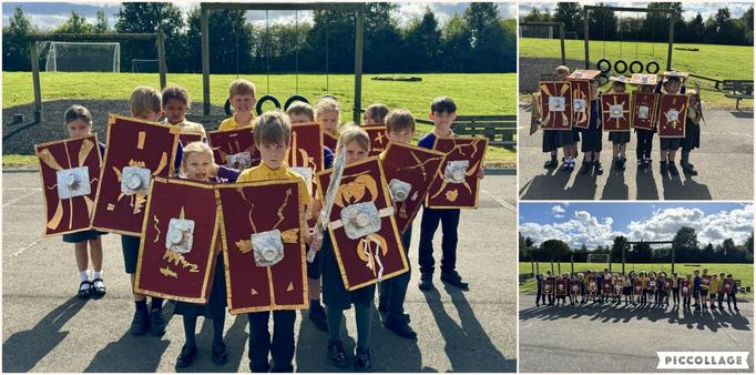 Year 3/4 thoroughly enjoyed making Roman shields (scutums) and then enjoyed trying them out, using different formations to defend (testudo or tortoise) and to attack( a wedge formation).